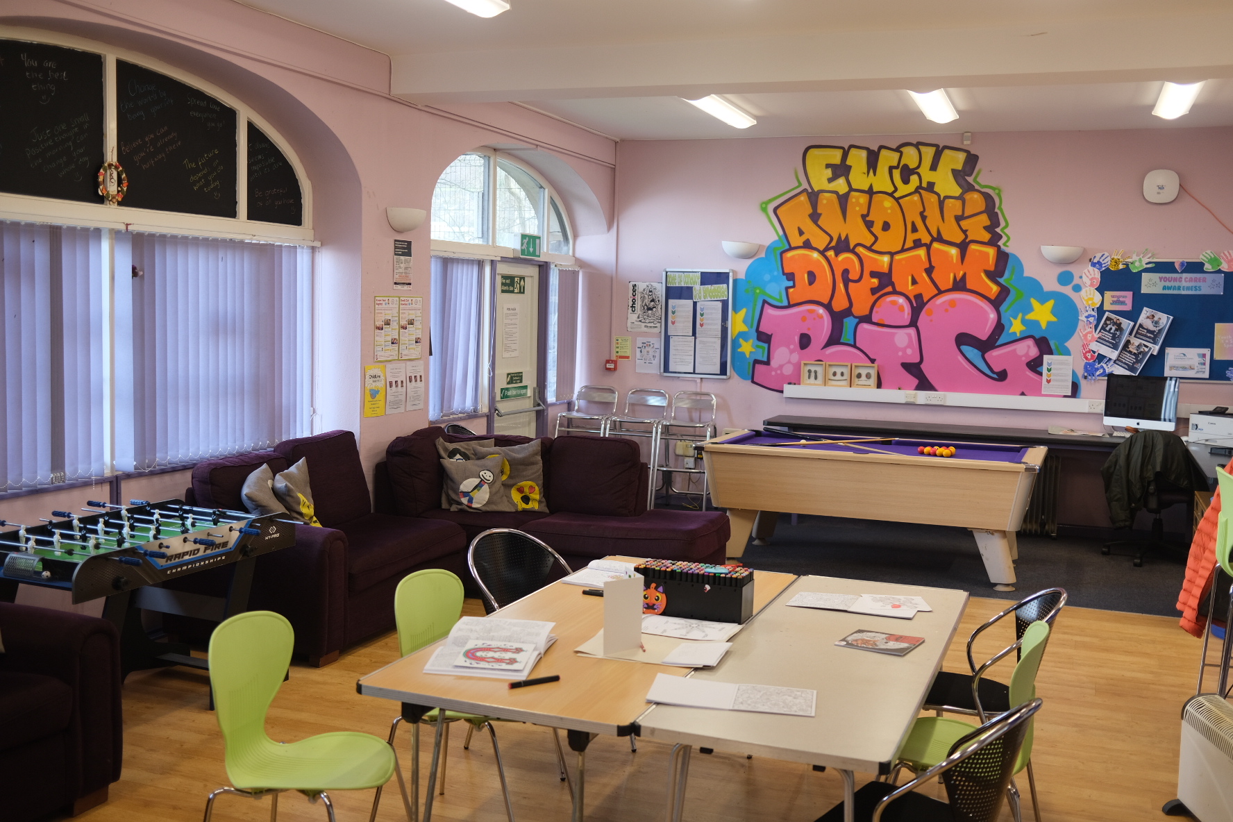 Beth sydd ar gael: bwrdd pwll, pêl-droed bwrdd, Xbox, celf a chrefft, gemau bwrdd, bag dyrnu, bysellfwrdd, bwyd a byrbrydau.